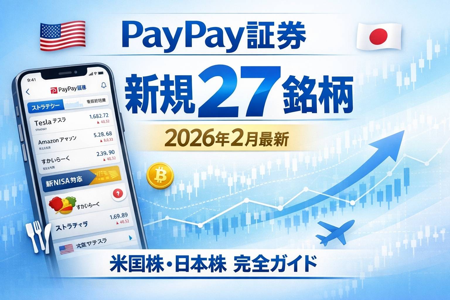 2026年2月、PayPay証券が米国株20銘柄・日本株7銘柄の計27銘柄を新規取扱開始すると発表しました。今回の追加銘柄には、ビットコイン関連で注目のストラテジー(MSTR)や、航空大手のユナイテッド・エアラインズ、外食チェーンのすかいらーくホールディングスなど、個人投資家に人気の銘柄が多数含まれています。本記事では、PayPay証券公式発表に基づき、各銘柄の特徴や投資魅力、配当金の受取方法まで徹底解説します。新NISAでの投資を考えている方、少額から株式投資を始めたい方にとって、見逃せない情報が満載です。