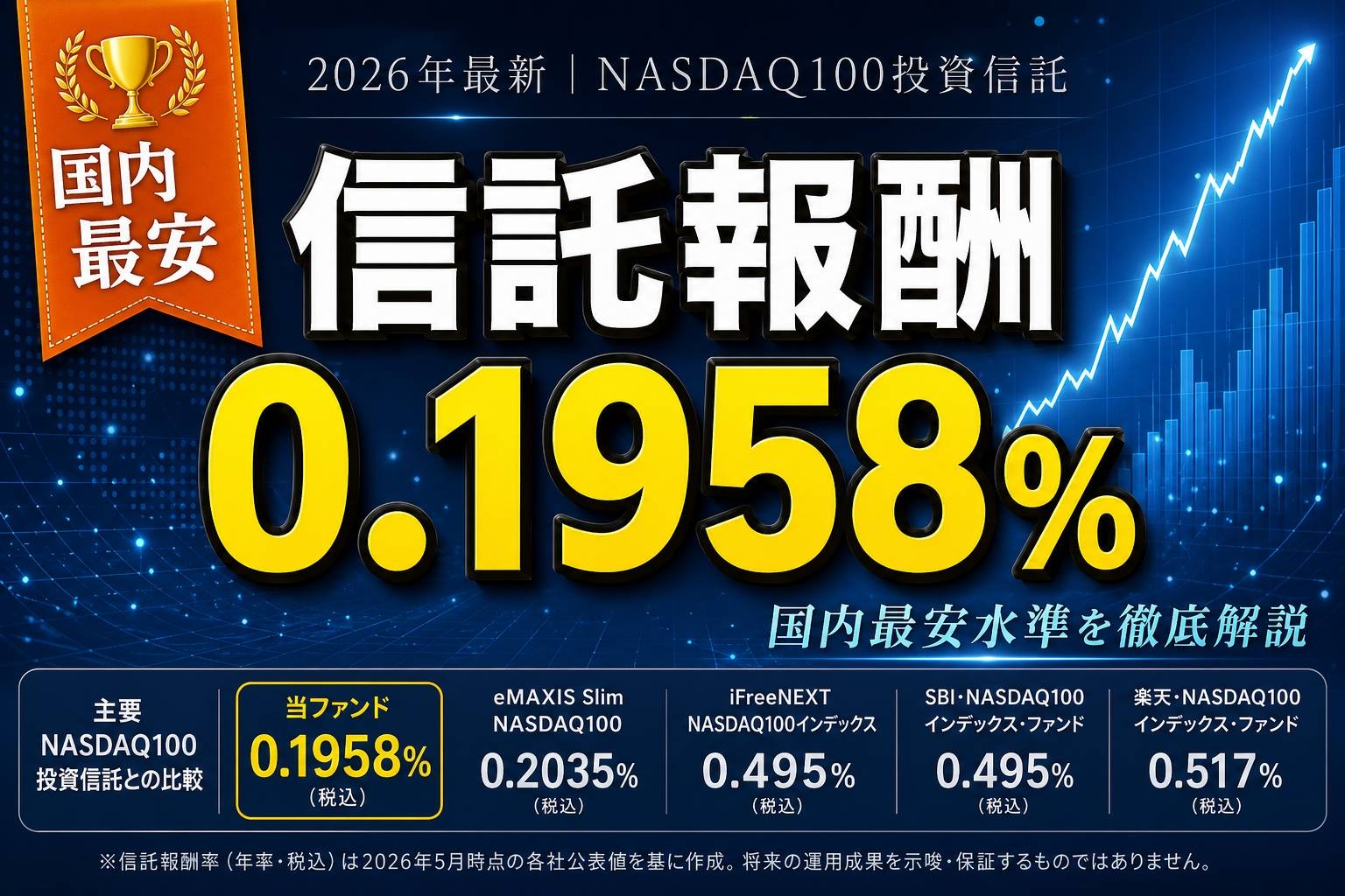 2026年5月、投資信託の世界に歴史的な激震が走りました。SBIアセットマネジメントが新たに設定する「SBI NASDAQ100インデックス・ファンド」の信託報酬は、なんと年率0.1958%。これは国内に流通するNASDAQ100連動ファンドの中で現時点の最安水準です。申込期間は2026年5月7日(木)〜5月20日(水)、運用開始は5月21日(木)を予定しています。