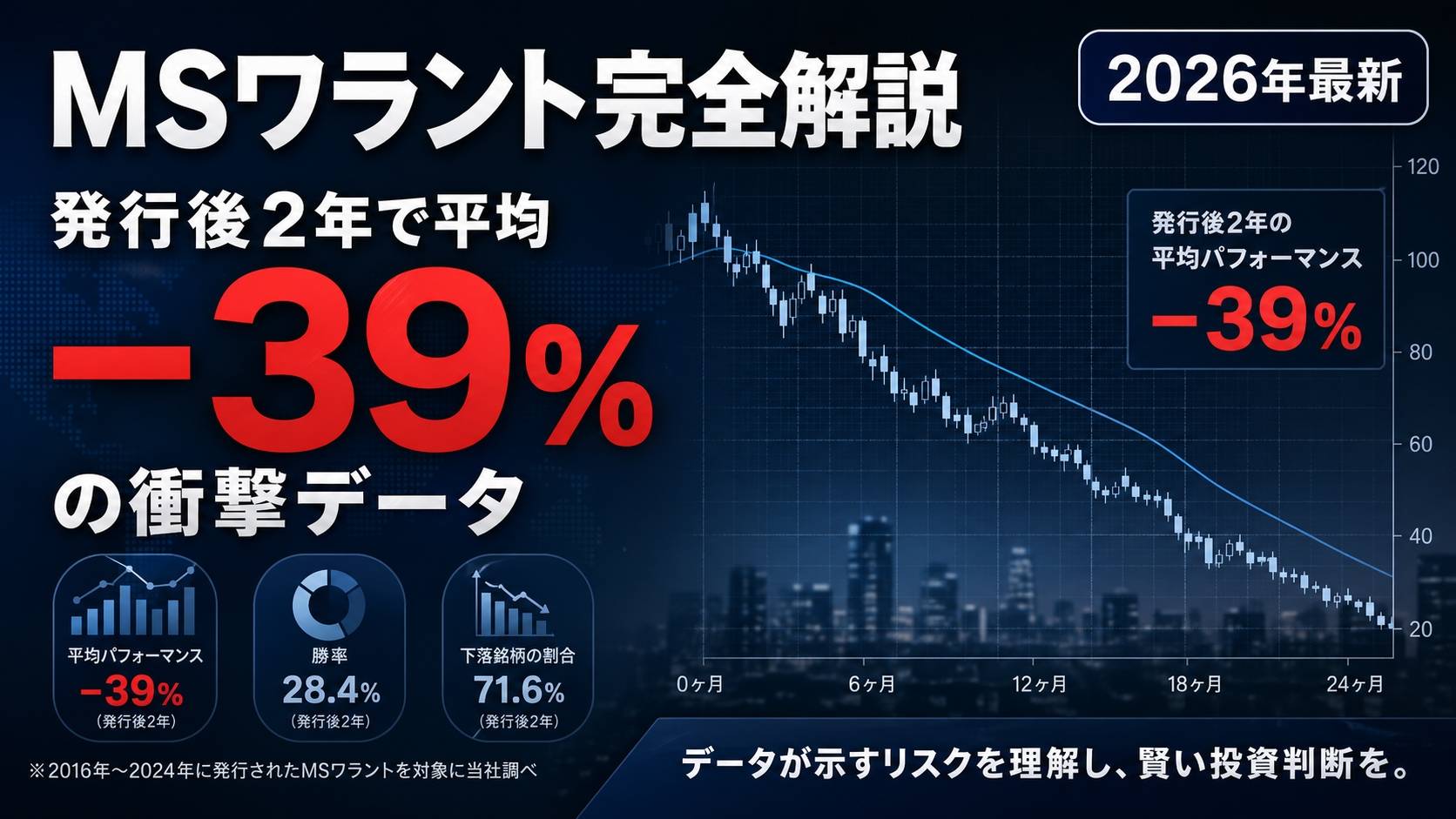 学術研究でもこの認識は裏付けられています。証券経済研究所の論文(服部孝洋・東京大学)によると、MSワラント発行の公表時点での株価下落は平均で約マイナス2.6%、さらにマーケット要因を除いた累積超過収益率は12ヶ月後にマイナス24.1%、24ヶ月後にはマイナス39.4%にも達するという結果が報告されています。つまり発表から2年後には株価が平均で約4割近く下落しているということです。この数字だけを見ても、投資家がMSワラント発行ニュースに強く反応する理由は明白です。